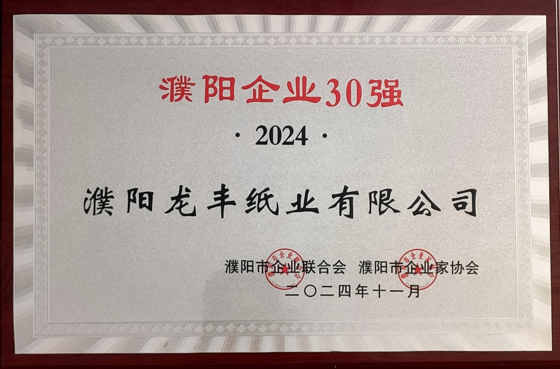 11月29日,濮陽市企業(yè)家聯(lián)合會(huì)、濮陽市企業(yè)家協(xié)會(huì)組織召開大會(huì),評(píng)選出2024濮陽市30強(qiáng)企業(yè),龍豐紙業(yè)再次榜上有名。
